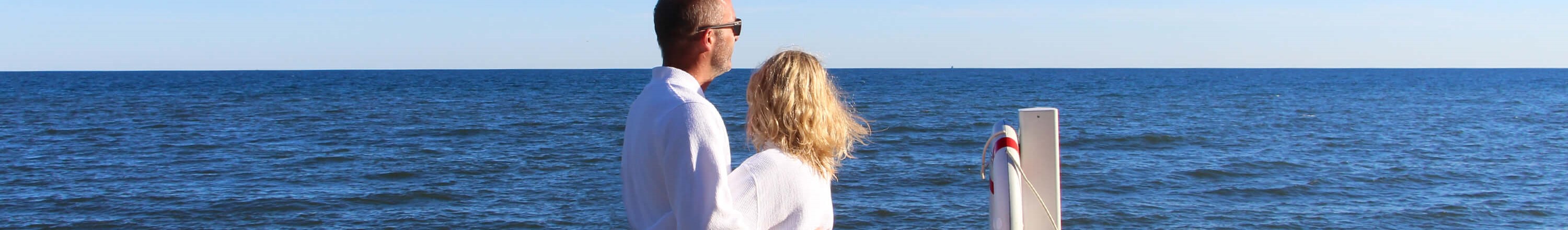 I forlængelse af restauranten finder du den overdækkede terrasse. Parasollerne med indbygget varme sørger for, at du kan sidde udenfor til langt ud på aftenen. Du kan også sætte dig i de udendørs loungeområde og nyde udsigten over havet.