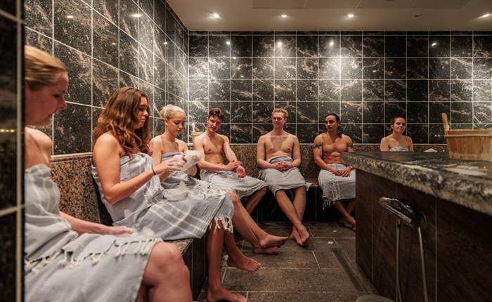 Prøv en hamam group experience, der renser huden i dybden og efterlader den silkeblød. Behandlingen består af en eksfolierende scrub, en blødgørende og plejende sæbeskum samt en let, afslappende massage. Behandlingen foregår i vores særlige hamamrum, og I skal have badetøj på under behandlingen.