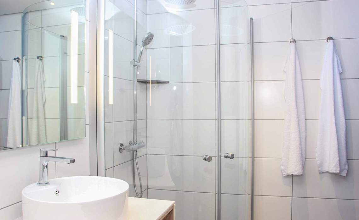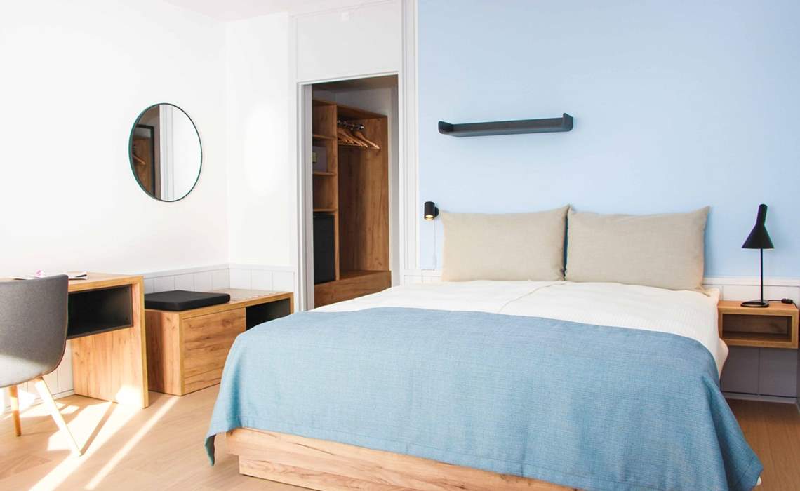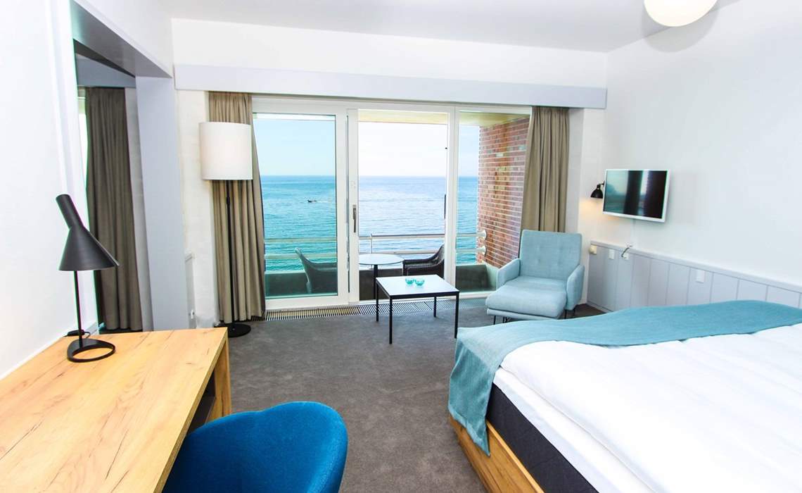 Værelserne til vandsiden har en flot havudsigt ud over den forbigående kystvej. Alle værelser har egen balkon med terrassemøbler. Der er skrivebord, garderobeskab, badeværelse med dusch/wc, elkedel, køleskab samt tv på værelset. Værelserne er beliggende i stueplan, 1. sal eller 2. sal. Der er adgang til elevator. Værelset kan også bookes til 1 person til en nedsat pris.