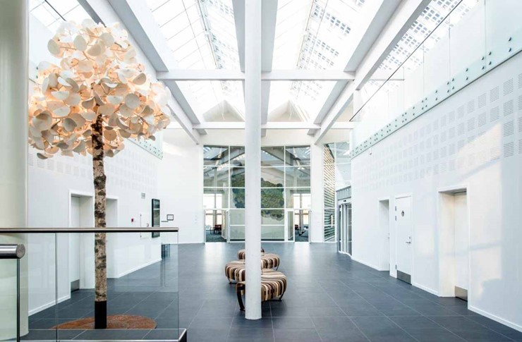 Daylight levels in the main building are high. For example, in the conference center the average daylight factor is 6.6 %, in the Smart Rooms it is 3.0 % and 1.9% in the hotel hallway