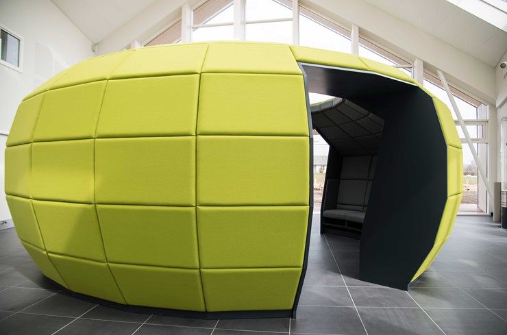 This flexible, modular, igloo shaped meeting room promotes new ways of meeting. Its hybrid and modular design creates a unique opportunity for a user-defined environment. The meeting space is digital friendly having screens that easily connect to our guests’ smart devices via Bluetooth. The igloo is made from prefabricated modular elements and can be easily disassembled and transformed for various needs. The textile cladded igloo makes for cozy acoustics.