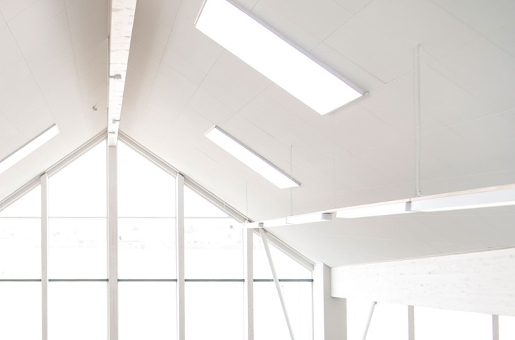 At Green Solution House we have been successful in balancing the thermal environment for optimal indoor comfort. We achieve comfort by balancing natural ventilation, mechanical ventilation and our heating strategy in response to the seasons. This strategy has resulted in the highest score possible in the Active House analysis of comfort in the building. Our diffuse ventilation strategy supplies fresh air through permeable acoustic panels in the conference center and restaurant ceiling and has two major advantages in terms of indoor climate. First, the even distribution lets us use cooler air without causing discomfort and drafts, and thus reduces supply air requirements and duct sizing. Second, by supplying cool air through the acoustic panels they act as a chilled ceiling, further supporting comfort by radiative cooling. In floor heating and cooling is supported by our on-site thermal energy storage system. Thermal glazing in the conference center maximises indoor comfort relative to solar exposure.