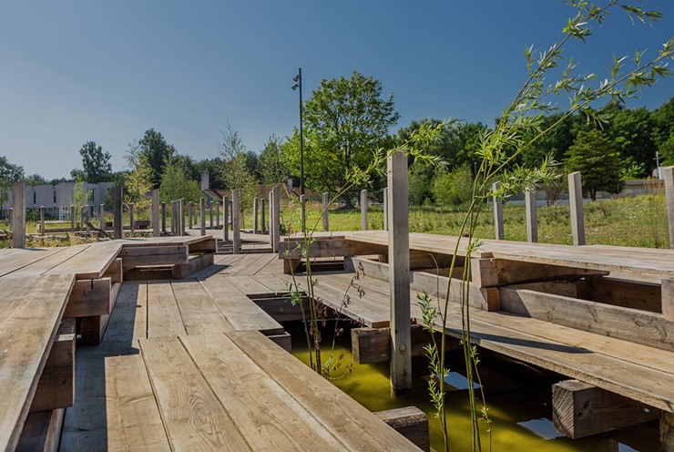 A landscape designed to flood. As a result of climate change, heavy and frequent rains put pressure on existing storm sewers and make flooding a risk. The high water table on the site poses a challenge, but instead of fighting nature and treating this as a problem, the landscape was designed around the element of water. The soil excavated for the foundation of the new building was retained on site and used to sculpt the landscape, embracing runoff from cloudbursts or heavy rainfall. Various watershed designs guide rainwater to seasonal ponds, creating an easy to maintain landscape, which increases biodiversity, provides natural irrigation, has a cooling effect in the summer months and even limits the hatching of mosquitoes. The gravel parking area is made with local granite waste and directs rainwater to a nearby wetland pond, en route the water passes through soils and a specific mix of gravel, to remove pollutants from the cars and ensure clean runoff.