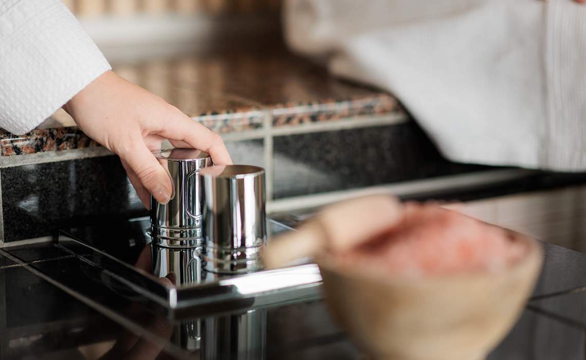 Stil dig foran vandfaldet, træk i rebet og lad kaskader af vand plaske ned over ryg og nakke. Spændinger i nakke og skuldre blødes op, når strømme af lunt vand fosser ned over hals og hoved. I midten af bassinet presser den underjordiske geyser blidt vandet mod dine fødder. Fortsæt videre til de bølgeformede liggebænke i spabadet, og slap af, mens du nyder stjernehimlen i loftet.